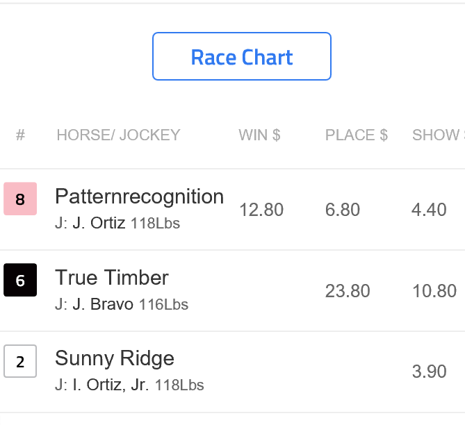 The actual order of finish was PATTERNRECOGNITION 1st, TRUE TIMBER 2nd, and SUMMER RIDGE 3rd. The $2 Exacta paid $216 dollars, while the one dollar Trifecta brought back $550.